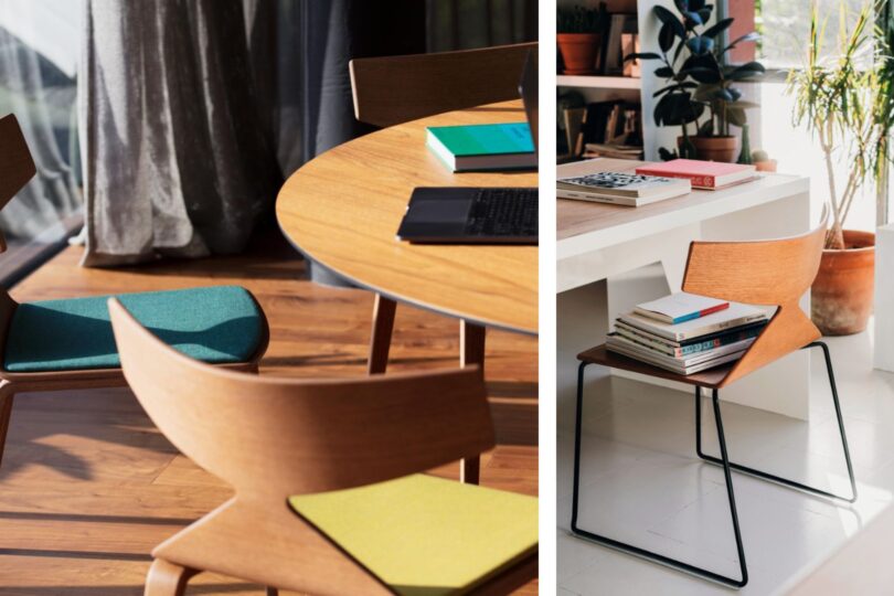 Dostępne w kilku wariantach: z podstawą z drewna, stali malowanej lub chromowanej – także w wersji siedziska barowego. Wszystkie modele wykonane są ze sklejki z naturalną okleiną dębową, opcjonalnie z tapicerowanym siedziskiem.